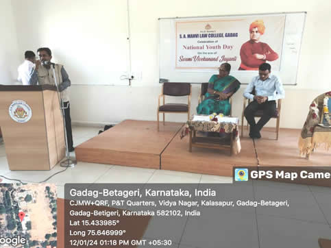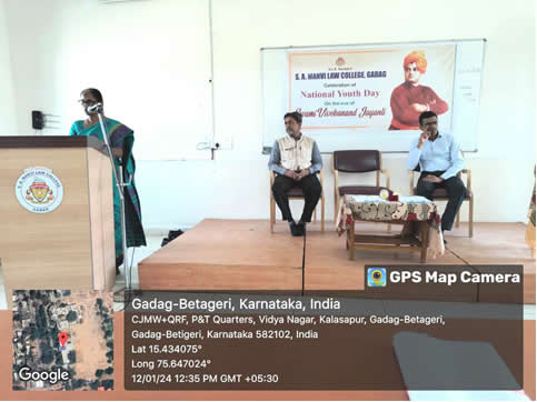The NSS Unit of the college has celebrated the “Swami Vivekanand Jayanti” on the eve of “National Youth Day” on the eve of Swami Vivekanand Jayanti held on 12th January, 2024 in the college. Dr. A. K. Math, Principal, KLE Society’s Arts & Commerce College, Gadag was the chief guest. She addressed the students that, giving reference of world famous Chicago conference, she said that Vivekananda’s was the only saint who is perceived as Vishwaguru. Vivekananda addressed the Chicago conference with such humble words, “My sisters and brothers of America”, that it touched the soul of all present there in Chicago .Vivekananda’s philosophy of life was taken as a path to service of humanity. Shri Jaihanuman H. K. Principal of the college and president of the function expressed the life of Vivekananda and the qualities which each human being must strive to possess for the betterment of life. The programme commenced with the welcome by Mr. Sharanappa Bhadrapur, 2nd Year LL.B. student. Mr. Basayya Veerapurmath, 2nd Year LL.B. student proposed the vote of thanks. Mr. Santosh Bhadrapur, 2nd Year LL.B. student was the master of ceremony. Dr. C. B. Ranagattimath, NSS Programme Officer coordinated the programme. All the students, teaching and non-teaching staff were present.